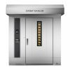 El horno está provisto de una plataforma giratoria de acero inoxidable, con una placa de fondo muy resistente a la torsión que no es presionada hacia abajo por el peso de los carros. En la plataforma es posible hornear hasta cuatro carros simultáneamente (según el tamaño de las placas). La horno tienen también una rampa muy robusta, del mismo material que la plataforma, que está reforzada con perfiles para aumentar más su resistencia. La rampa es regulable en altura, lo que permite adaptarla exactamente al nivel de la plataforma